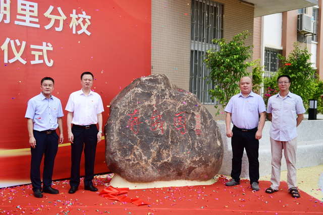 ▲象嶼集團(tuán)黨委副書記、工會(huì)主席邵蕰默(左二)、殿前街道黨工委副書記陳劍鳴(右二)、湖里區(qū)教育局教育工會(huì)常務(wù)副主席胡萬(wàn)友(右一)、廈門外國(guó)語(yǔ)學(xué)校湖里分校黨總支書記、校長(zhǎng)胡劍豪(左一)共同為“有成園”揭牌。