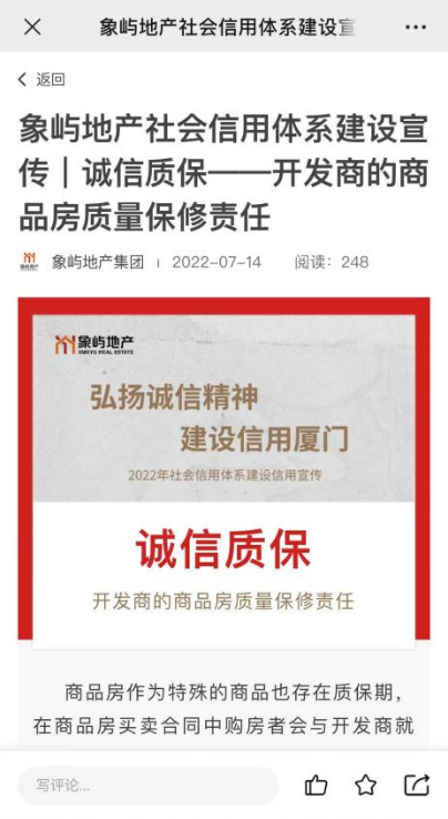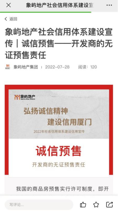 象嶼地產(chǎn)以報道誠信企業(yè)案例、倡導(dǎo)高品質(zhì)產(chǎn)品和服務(wù),弘揚全社會誠信典型的精神。同時,結(jié)合培育與踐行社會主義核心價值觀工作,象嶼集團不定期通過微社區(qū)發(fā)布誠信典型事跡,褒揚誠實守信的先進典型:象嶼創(chuàng)投組織員工進行《廈門市社會信用體系建設(shè)2022年工作要點》自行學(xué)習及廉潔從業(yè)書籍閱讀,提升員工對信用體系建設(shè)的理解;象嶼興泓公司組織先進分享業(yè)務(wù)及安全骨干心路分享活動,銷售副總對各業(yè)務(wù)部門業(yè)務(wù)開展情況進行點評,展現(xiàn)了象嶼集團引導(dǎo)廣大職工學(xué)習先進,發(fā)揮先進的示范引領(lǐng)帶動作用,為廈門這座全國文明典范城市創(chuàng)建助跑添力。