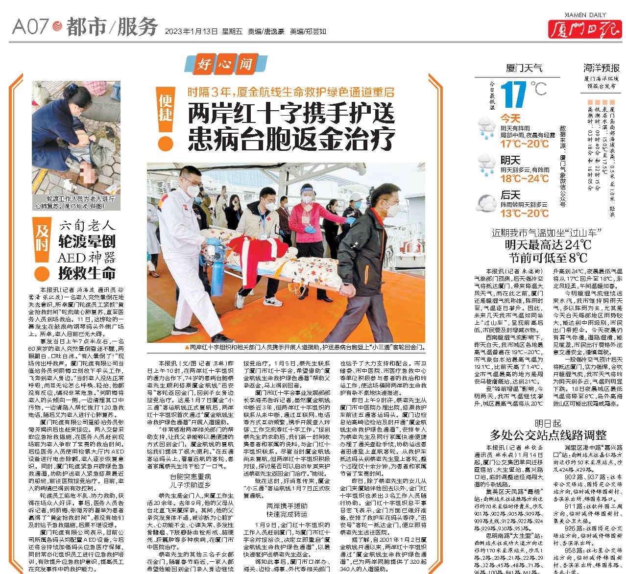 上述老人是廈門(mén)輪渡公司員工在短短8天里挽救的第二條生命。在春節(jié)將至的特殊日子里,他們用飽含大愛(ài)之心的“生死競(jìng)速”,守護(hù)著每一個(gè)中國(guó)家庭共有的平安團(tuán)圓夢(mèng)。