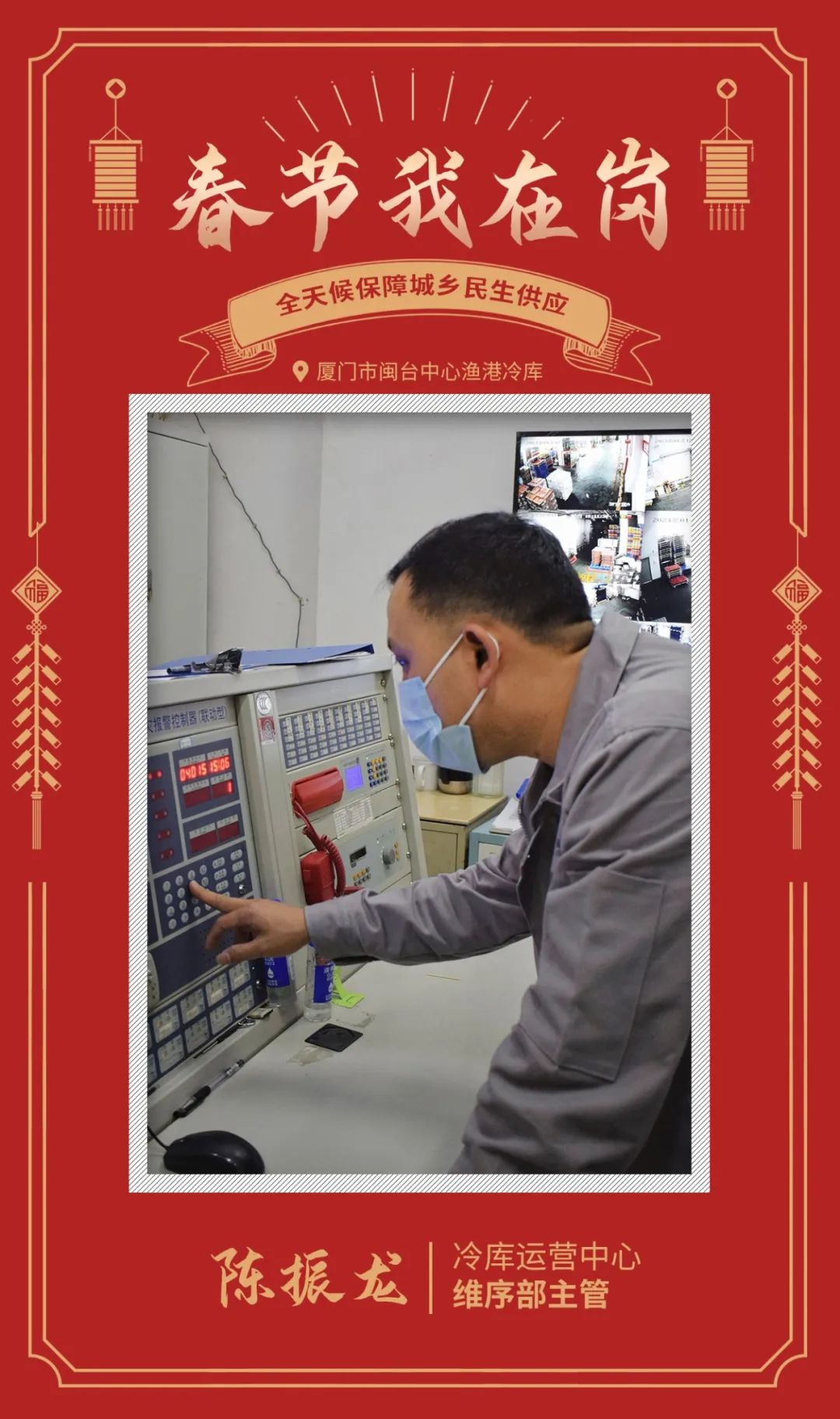 閩臺(tái)中心漁港冷庫(含超低溫冷庫)項(xiàng)目為廈門市商務(wù)局“城鄉(xiāng)民生基礎(chǔ)設(shè)施”,并于2020年納入市重點(diǎn)物流項(xiàng)目,需要全年24小時(shí)全天候執(zhí)勤。春節(jié)期間,陳振龍堅(jiān)守崗位一線,確保冷庫運(yùn)營中心消防系統(tǒng)、電系統(tǒng)設(shè)施設(shè)備安全運(yùn)行,協(xié)調(diào)包庫客戶合理分配裝卸平臺(tái),做好提、送貨車輛調(diào)度,為城鄉(xiāng)民生供應(yīng)鏈提供保障。