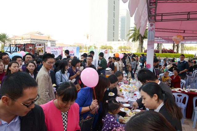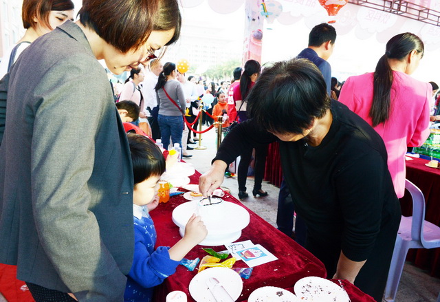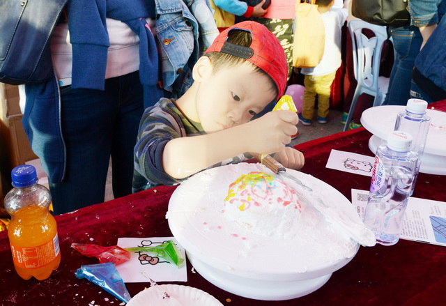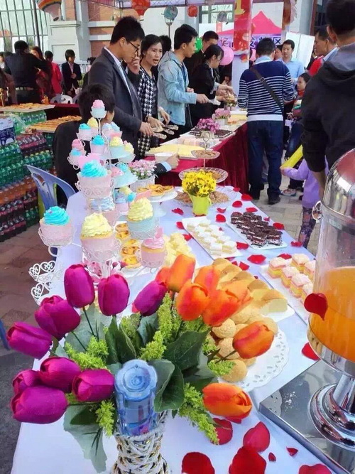 在這喧囂熱鬧中,有一個地方排起了一溜長隊(duì)。這里就是食品區(qū)了,吃貨們早已被這琳瑯滿目的飲料,小巧精致的甜品惹得食指大動啦~吃了享受美食,精心設(shè)置的蛋糕DIY環(huán)節(jié),也讓大朋友、小朋友興奮不已,抹奶油、裱花、畫糖漿,雖然是第一次做蛋糕,卻全神貫注,細(xì)致入微,一招一式頗有章法。