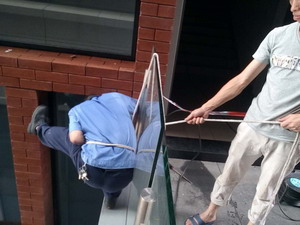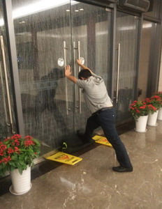 王志富是臺風(fēng)登陸當(dāng)晚象嶼高尚物業(yè)公司留下值守的54位員工中的一個(gè),他負(fù)責(zé)國際航運(yùn)中心D棟的安全。D棟處于風(fēng)口位置。凌晨2點(diǎn)多,風(fēng)大作,雨加急,那聲勢猶如排山倒海,讓這位魁梧的大漢也是心驚。眼看防汛沙袋做的大門加固也無法阻擋風(fēng)雨的侵入,他不顧只身一人,奮力頂住玻璃大門?!耙坏┯晁嗳氪筇?,流入電梯井,后果不堪設(shè)想!”聞訊趕來增援的4位值守人員也都撲上來用力頂住大門,五人使足了勁,一個(gè)多小時(shí)后,風(fēng)力減弱,他們以堅(jiān)定的意志戰(zhàn)勝了狂暴的臺風(fēng),玻璃門沒有倒下,D棟安全了!