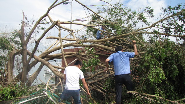 “莫蘭蒂”的威力是巨大的,在其登陸前兩個(gè)小時(shí),港區(qū)電壓開始呈現(xiàn)不穩(wěn)定狀態(tài),時(shí)亮?xí)r暗。蘇展是值守港區(qū)的電工,為了讓安置在避險(xiǎn)中心的數(shù)千船員有明亮的燈光,他不顧個(gè)人安危,冒著狂風(fēng)暴雨前往配電室進(jìn)行檢查。路上被風(fēng)刮起的鐵板將衣服劃破,所幸沒有受傷?!半娎|溝進(jìn)水導(dǎo)致了短路,港區(qū)全部跳閘停電,路燈燈頭也被摧毀?!碧K展有些無奈,雖然如此,他仍堅(jiān)守在配電室直至風(fēng)雨漸收,確保了配電室設(shè)備沒有受到破壞。