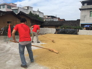 曬谷場的大姐說,曬谷并不簡單,遇上天氣不好要反復(fù)收回,再次拆包、攤平、晾曬。曬谷揚起的灰色還容易造成皮膚過敏。我嘗試了幾下已經(jīng)感受到腰部手臂的負荷。農(nóng)活很艱苦,但曬谷大姐仍是每日不厭其煩地勞作,微笑面對自己的生活。