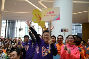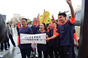 下雨天,依舊湮滅不了象嶼人的熱情。挑戰(zhàn)團(tuán)隊(duì)們紛紛冒雨接受挑戰(zhàn),4位隊(duì)員齊心協(xié)力地推動載著17位小伙伴的中巴車。