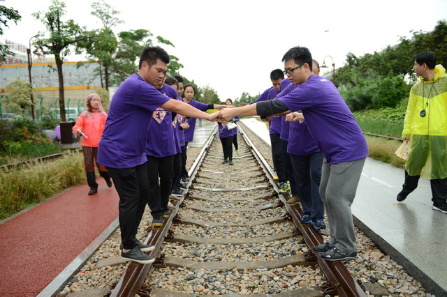 雨勢漸大,但為了節(jié)約時(shí)間,迅速完成任務(wù),許多隊(duì)員放棄穿戴現(xiàn)場發(fā)放的雨衣,疾步在雨中接受挑戰(zhàn)。有的隊(duì)員多次失誤,隊(duì)友們不僅不加以責(zé)怪,而是一齊鼓勵(lì)。他們手拉著手,一同喊著團(tuán)隊(duì)口號,憑著團(tuán)隊(duì)間的相互信賴與默契,冒雨艱難地完成了任務(wù)。