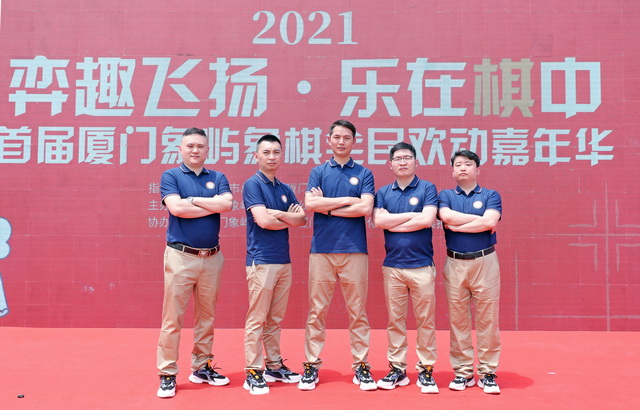 ▲廈門象嶼象棋隊(duì)隊(duì)員象棋特級(jí)大師鄭一泓(中)、張學(xué)潮(左二)、郝繼超(左一)和象棋大師陳泓盛(右二)、苗利明(右一),即將代表廈門出征。