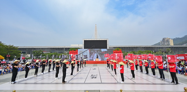 以天為蓋,以地為棋盤,32位頭戴斗笠、手舉刀旗的志愿者正身臨“棋”境,搭配武俠風(fēng)背景樂(lè),在五一文化廣場(chǎng)上行走廝殺,指揮他們的是象棋特級(jí)大師郝繼超、張學(xué)潮。
