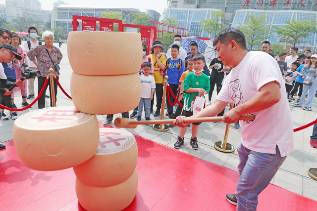 在象棋大擺錘游戲區(qū)前,只要敲擊掉5顆大象棋中間的1顆,并保證其他棋子不倒,便能闖關(guān)成功。只見(jiàn)大小朋友們輪番上陣,掄起大擺錘使勁敲擊,有人使出洪荒之力,不慎將象棋全部打翻;有人精準(zhǔn)打擊卻用力不足,象棋巋然不動(dòng)……幾回合下來(lái),大家終于掌握了制勝法寶——精準(zhǔn)施力。歡笑聲在各大游戲互動(dòng)區(qū)洋溢,不少闖關(guān)成功的市民,手捧精美禮品,滿載而歸。