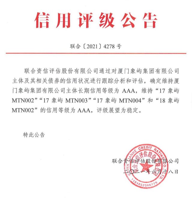 6月21日,國內(nèi)權(quán)威評級機構(gòu)聯(lián)合資信評估股份有限公司(以下簡稱“聯(lián)合資信”)發(fā)布廈門象嶼集團(tuán)有限公司(以下簡稱“象嶼集團(tuán)”)2021年跟蹤評級報告,確定維持象嶼集團(tuán)主體長期信用等級和公司債券信用等級為AAA,評級展望為穩(wěn)定。