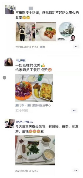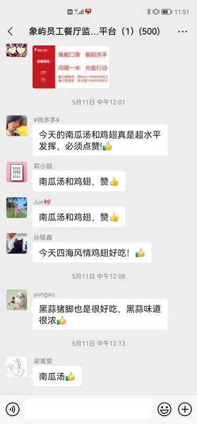 它更美在有家的感覺。每逢節(jié)日,餐廳用精心準(zhǔn)備的美食,送上滿滿的祝福。婦女節(jié)女神披薩、母親節(jié)養(yǎng)生湯、端午肉粽、中秋月餅……舌尖上的幸福,飽含著家的溫暖。餐廳還先后建立4個交流微信群,參與員工近2000人。象嶼家人們的每一項(xiàng)意見、建議,餐廳都會迅速答復(fù),并每周公示員工反饋問題的解決進(jìn)展。在交流群里、在朋友圈里,員工的點(diǎn)贊之聲不絕于耳,餐廳平均滿意度保持在90%以上。