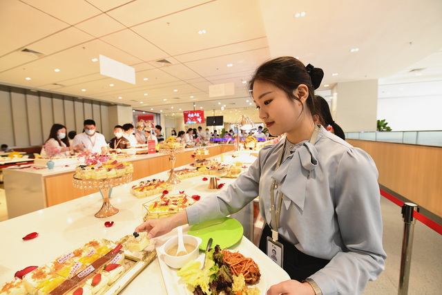 它美在菜品豐富。餐廳設(shè)置自助餐區(qū)、健康輕食區(qū)和四個特色檔口,每餐供應(yīng)菜品20余款,涵蓋煲仔飯、手工拉面、西餐、特色小吃以及各地口味餐食,做到一周菜品不重復(fù),每周至少推出一款新菜。