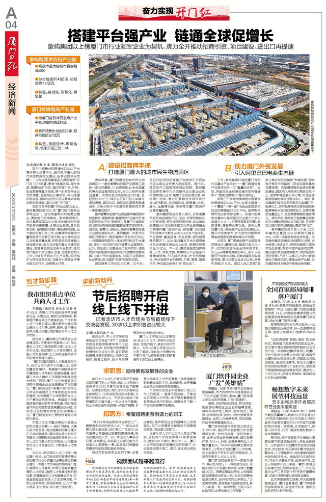 象嶼集團(tuán)相關(guān)負(fù)責(zé)人介紹,2021年集團(tuán)在廈進(jìn)出口總額同比增長35%,今年1月繼續(xù)保持在快車道。未來象嶼集團(tuán)將繼續(xù)加快國際化進(jìn)程,充分連接、持續(xù)運(yùn)用、積極拓展國內(nèi)國際市場及資源,幫助中國產(chǎn)品走向世界,提升國際供應(yīng)鏈競爭能力,同時(shí)把國外好的資源、產(chǎn)品引入國內(nèi),為助力我國進(jìn)出口穩(wěn)定向好,增強(qiáng)全球產(chǎn)業(yè)鏈、供應(yīng)鏈的韌性與穩(wěn)定不斷做出新貢獻(xiàn)。