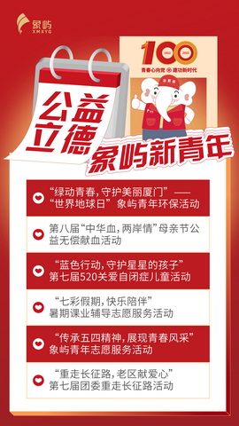 “計利天下 相與有成”的象嶼,造就出一代代“為世界進文明,為人類造幸福”的新青年。本次活動將延續(xù)象嶼傳統(tǒng),組織系列公益志愿服務(wù),燃燒青春之火,傳遞溫暖大愛。同時,集團及各投資企業(yè)也將積極開展“我為青年辦實事”實踐活動,為象嶼青年掃除成長的后顧之憂。