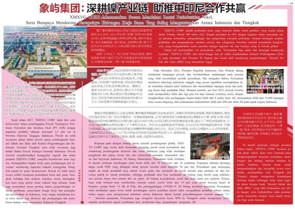 昨天,商務(wù)部《國際商報》以《象嶼集團(tuán):深耕鎳產(chǎn)業(yè)鏈 助推中印尼合作共贏》為題刊發(fā)專題報道,介紹象嶼集團(tuán)在印尼投資建設(shè)年產(chǎn)250萬噸不銹鋼冶煉一體化項目,推動高質(zhì)量共建“一帶一路”,促進(jìn)中印尼兩國經(jīng)貿(mào)合作和人文交往的突出成效。